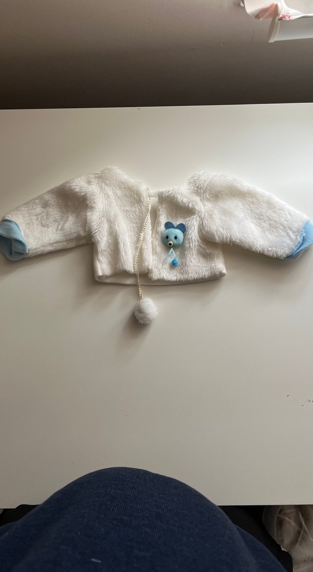 Uzun kollu, yuvarlak yaka, yumuşak ve sıcak kumaştan yapılmış, kürk detaylı kız çocuk bolero. Pastel mavi manşetleri ve işlemeli ayı deseni bulunur.