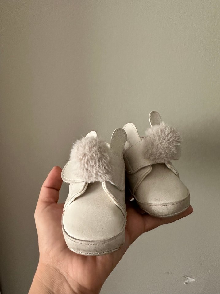 Yumuşak ve sıcak kumaştan, kürk detaylı beyaz kız bebek ilk adım ayakkabısı, sade ve şık tasarımda.