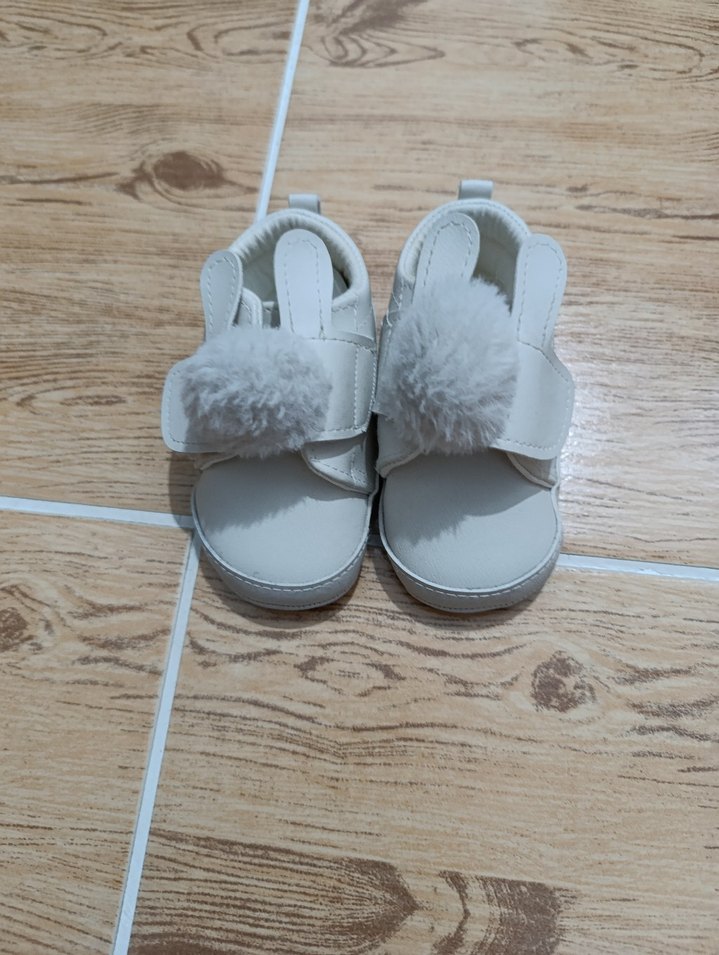 Kız bebekler için beyaz, yumuşak kürk detaylı ve sade kauçuk malzemeden yapılmış ilk adım ayakkabısı.