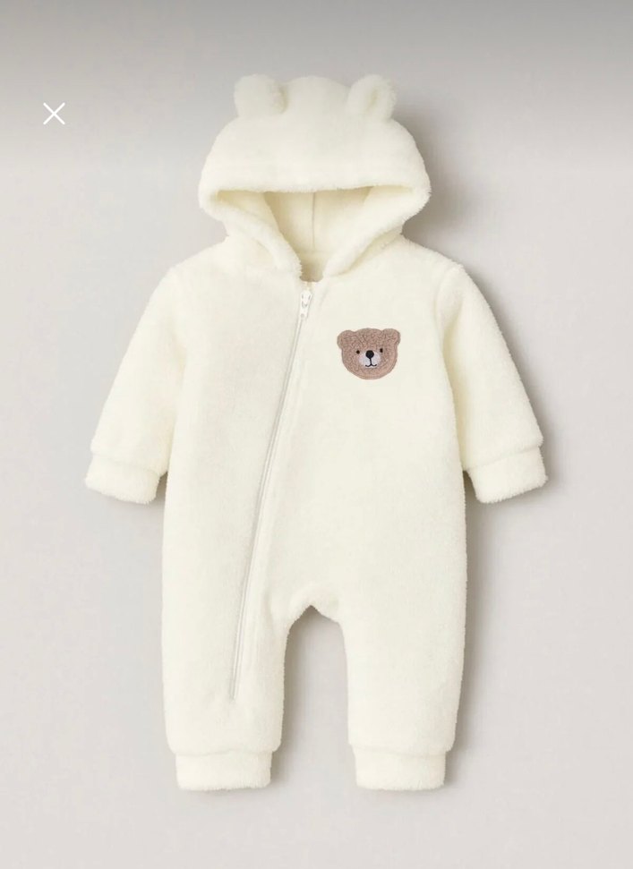 Beyaz renkli kız bebek tulumu, yumuşak kürk detayları ve nakışlı ayı deseni içerir. Yuvarlak yakalı ve pastel tonlardadır.