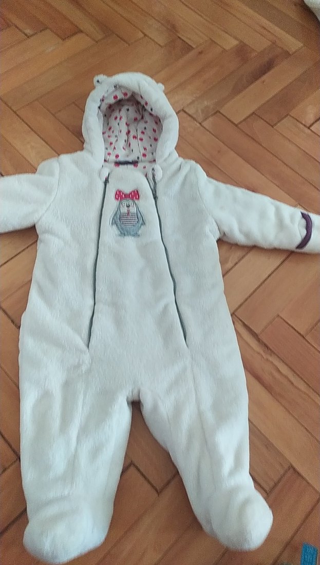 Kürklü detaylı, nakışlı beyaz kız bebek tulumu. Çentikli yaka ve yumuşak, sıcak dokusu vardır.