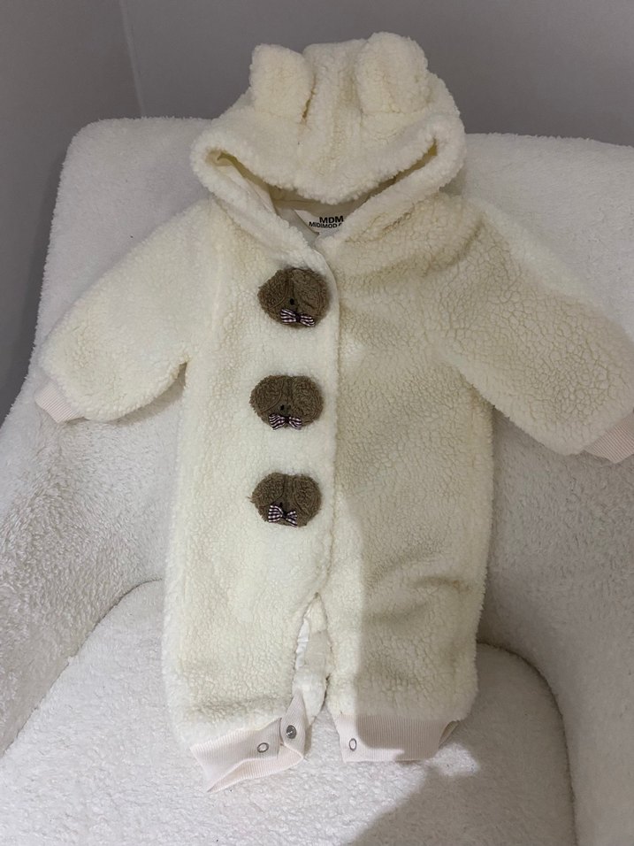 Yumuşak kumaşlı, önü kürk detaylı beyaz kız bebek tulumu. Kulaklı kapüşon ve kesimli yaka bulunur. ❄️