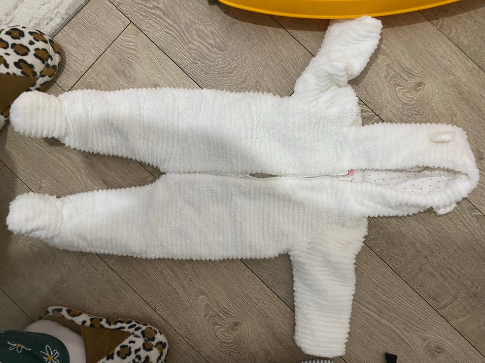 Beyaz renkli kız bebek tulumu, yumuşak kürk detayları ve notched lapel yakası ile konfor sağlar. Düz ve gri tonludur. ❄️