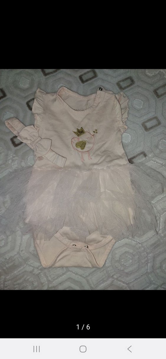 Pamuklu, nakış detaylı ve fırfırlı beyaz kız bebek elbisesi, uyumlu saç bandıyla birlikte sunulur. cok giyilmedi lekesiz