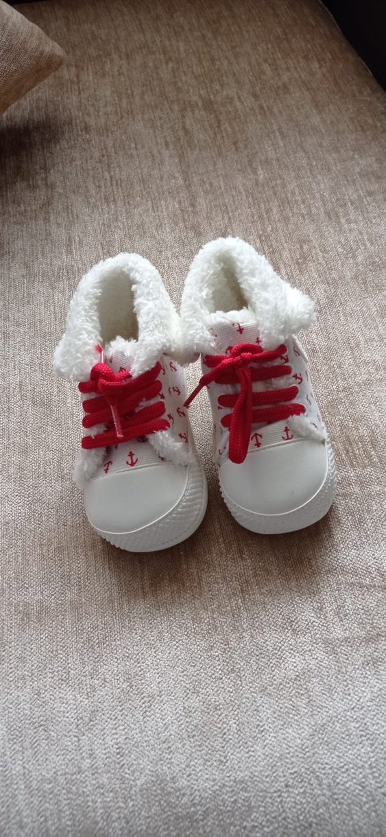 Yumuşak kürklü, renkli nakışlı desenli, cırt cırtlı beyaz kız bebek ilk adım ayakkabısı. Trendy casual tarzda, kırmızı bağcıklı.