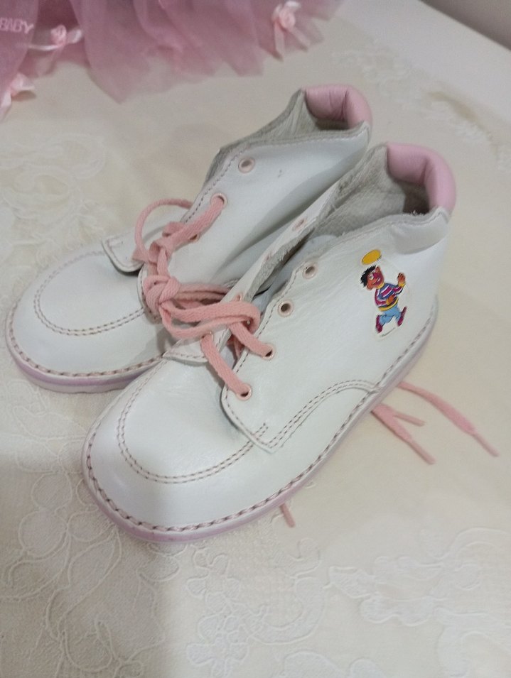 Beyaz kauçuk ilk adım ayakkabısı, pastel pembe bağcıklar ve nakış detaylarıyla trend sokak stili için uygun.