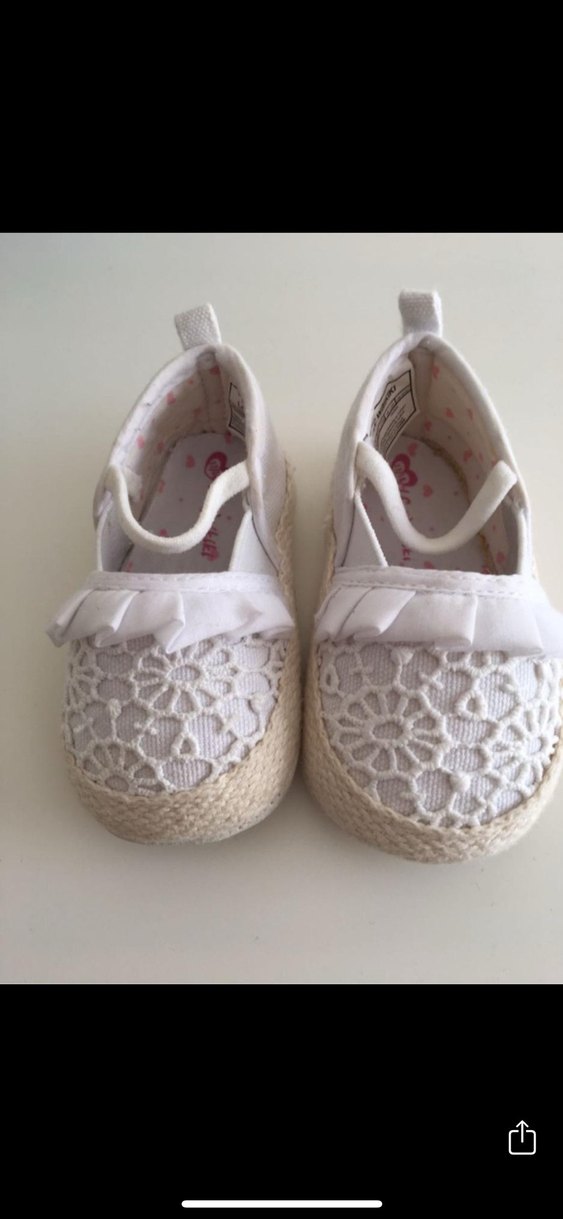 Beyaz, nakışlı dantel detaylı, hafif bohem tarzda kız bebek ilk adım ayakkabısı, kauçuk tabanlı. Temizdir