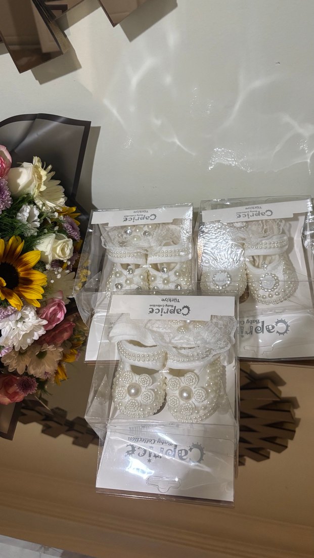 Kız bebekler için beyaz örgüden yapılmış, dantelli ve nakışlı, inci süslemeli klasik patikler. ✨