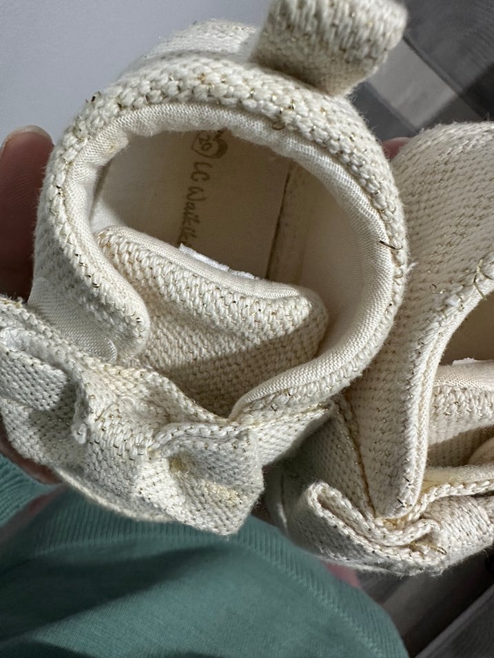 Beyaz renkli, örgü kumaştan yapılmış, işlemeli detaylara sahip kız bebek ilk adım ayakkabısı, sade bohem tarzda.