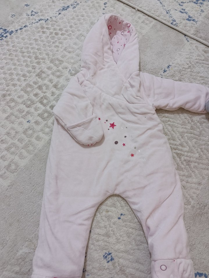 Kapüşonlu, yumuşak peluş detaylı pastel beyaz kız bebek tulumu, sade yıldız desenli. Soğuk havalar için sıcak tutar. ❄️ yurtdışı malı (6-9ay)