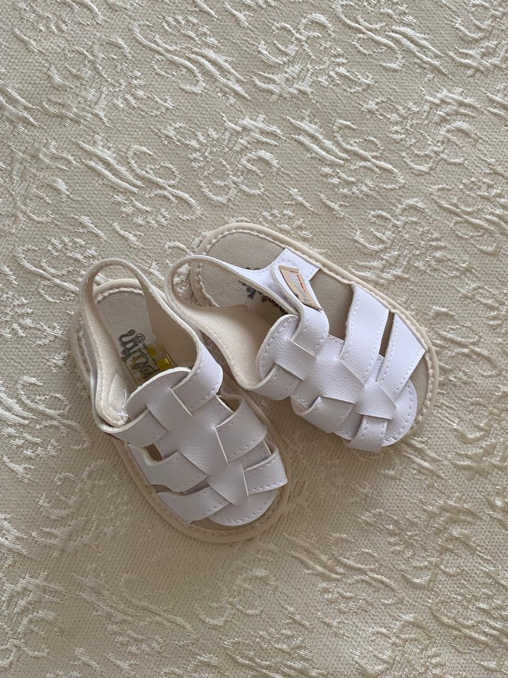 Beyaz kız çocuk sandaletleri, tokalı kapanış ve rahat kauçuk taban ile sade tasarıma sahiptir. Klasik, desensiz stilde günlük kullanıma uygundur. E bebekten aldım.