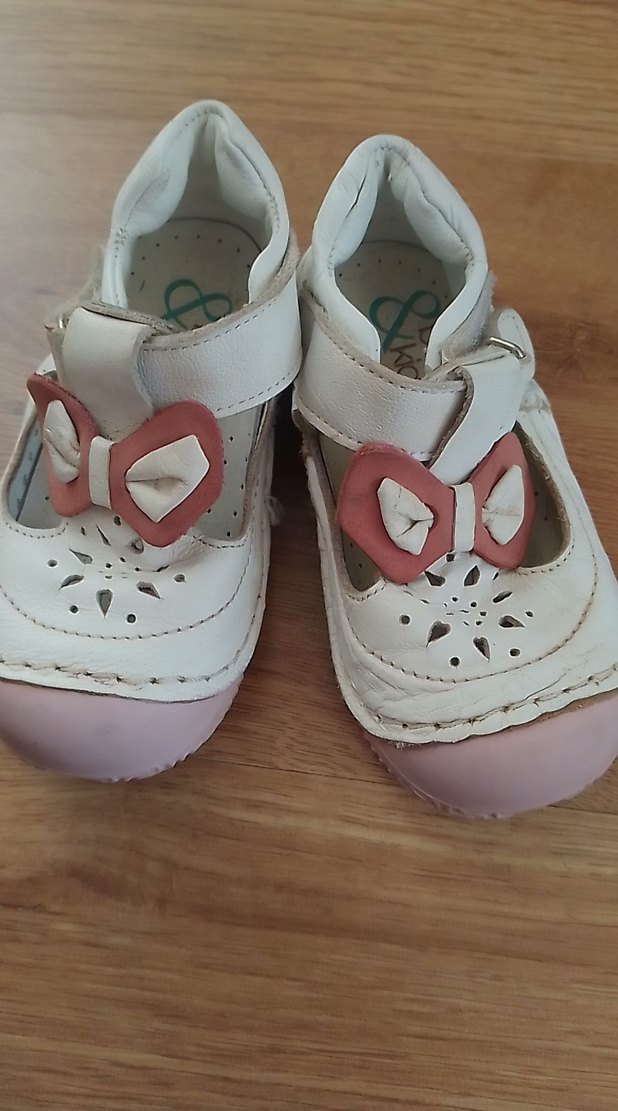 Kız bebekler için beyaz, tokalı, yumuşak kauçuk tabanlı bohem tarzda ilk adım ayakkabısı.