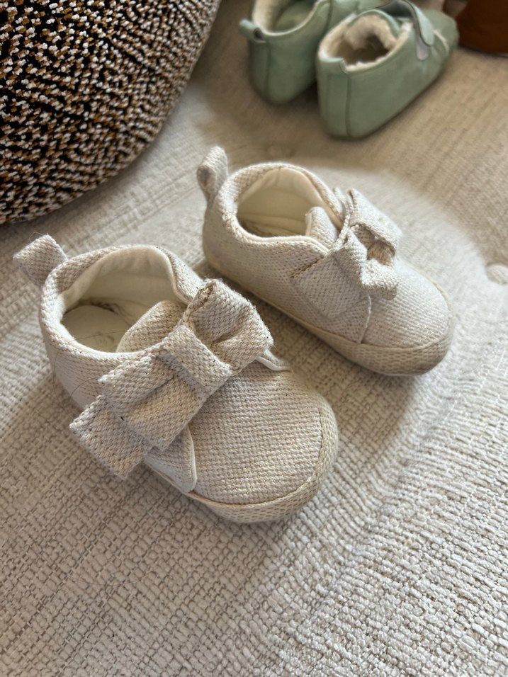 Kız bebekler için beyaz renkte, triko kumaştan yapılmış fiyonk detaylı ilk adım ayakkabısı. Düz, bohem tarzda ve desen içermeyen rahat bir modeldir.