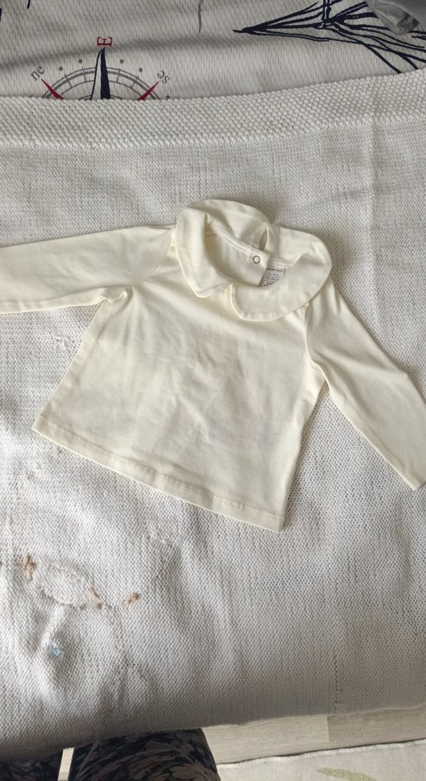 Kız bebek için uzun kollu, yakalı, yumuşak pamuklu kumaştan yapılmış, bol kesim ve sade beyaz renkte bluz. hiç kullanılmadı etiketi yok