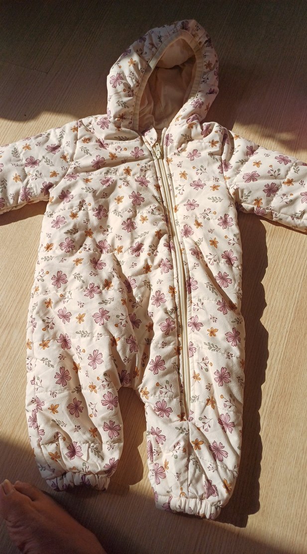 Pastel beyaz renkte, çiçek desenli kız bebek tulumu. Notlu yaka ve ön fermuar detayına sahiptir, kolay giyilir ve sıcak tutar. ❄️
