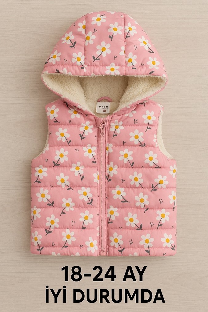 Pembe kapüşonlu kız bebek yeleği, çiçek desenli ve içi yumuşak kürk detaylıdır. Kolsuz ve 18-24 ay arası çocuklar için uygundur.