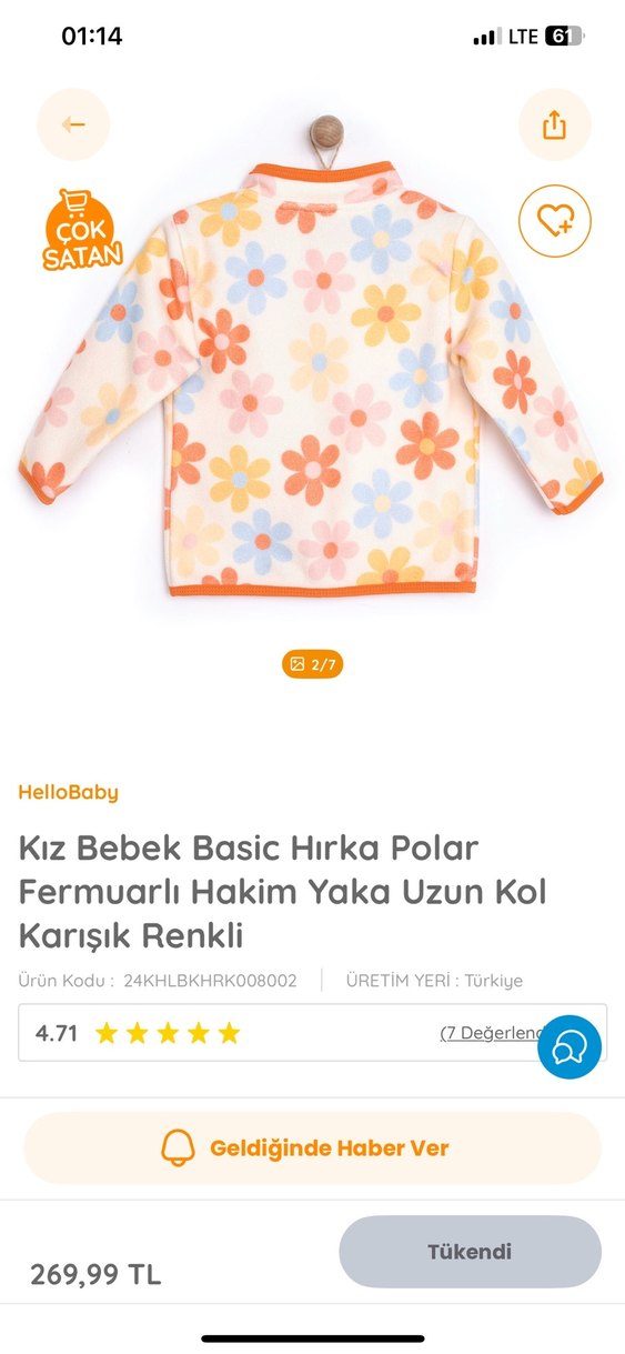 Kız bebekler için fermuarlı, uzun kollu, yumuşak kumaşlı, pastel çiçek desenli polar hırka. Türkiye üretimi, HelloBaby markası.