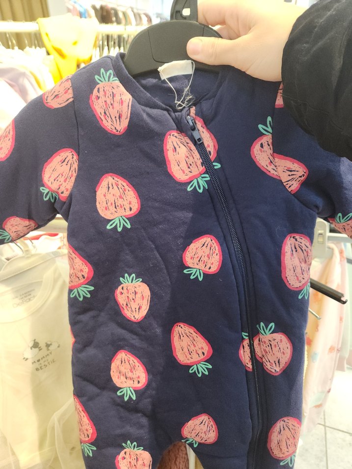 Renkli, fermuarlı ve yuvarlak yakalı kız bebek tulumu. Üzerinde çilek desenleri bulunur.