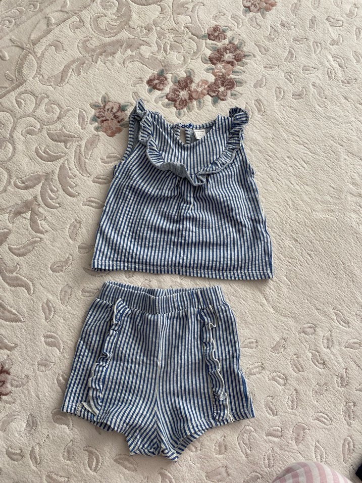 Kolsuz, çizgili üstte fırfır detayları ve yanları fırfırlı şorttan oluşan kız bebek takımı. Mavi ve gri tonlarında yumuşak kumaş.
