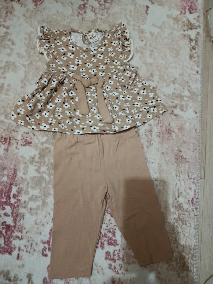 Kız bebek için dantelli, çiçek desenli kolsuz üst ve pastel kahverengi pantolondan oluşan takım.