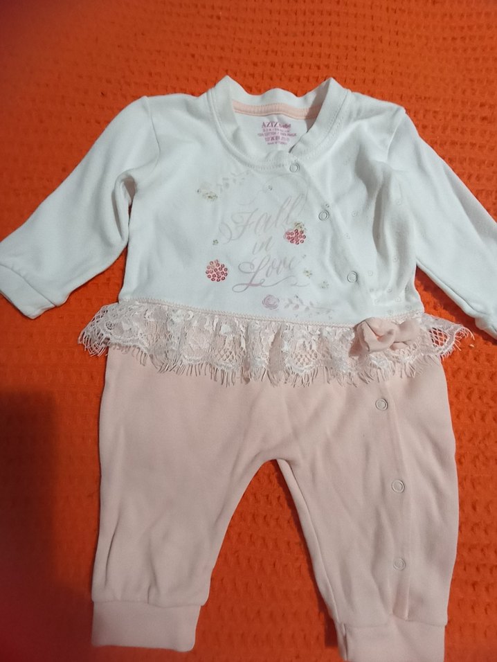 Uzun kollu, yumuşak kumaşlı bebek tulumu, dantel detayları ve pastel baskılar içerir. Beyaz üst ve pastel pembe alt, çıtçıtlı kolay giyim sağlar.