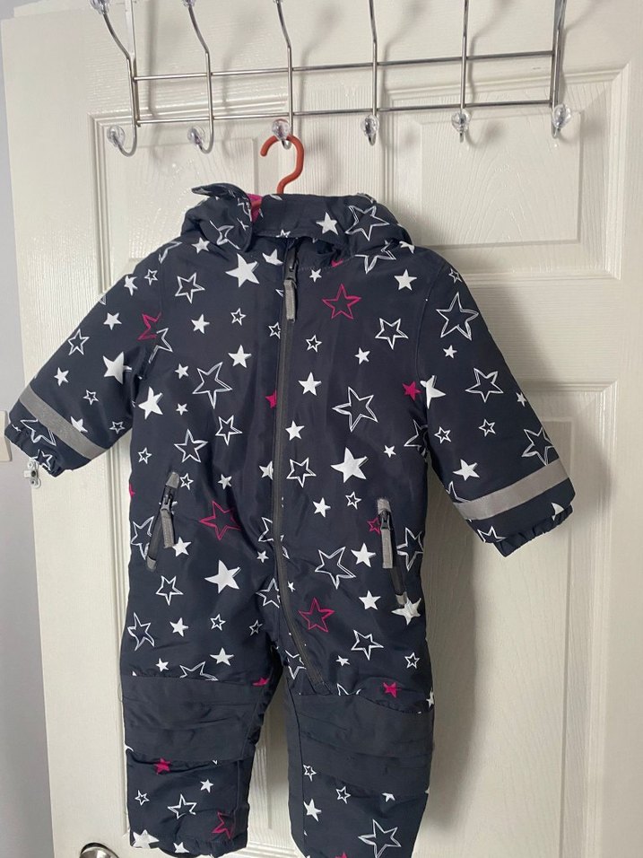Koyu gri renkli, yıldız desenli kız bebek kış tulumu, çıtçıtlı ve kesimli yakalı, soğuk havalar için sıcak tutar ❄️.