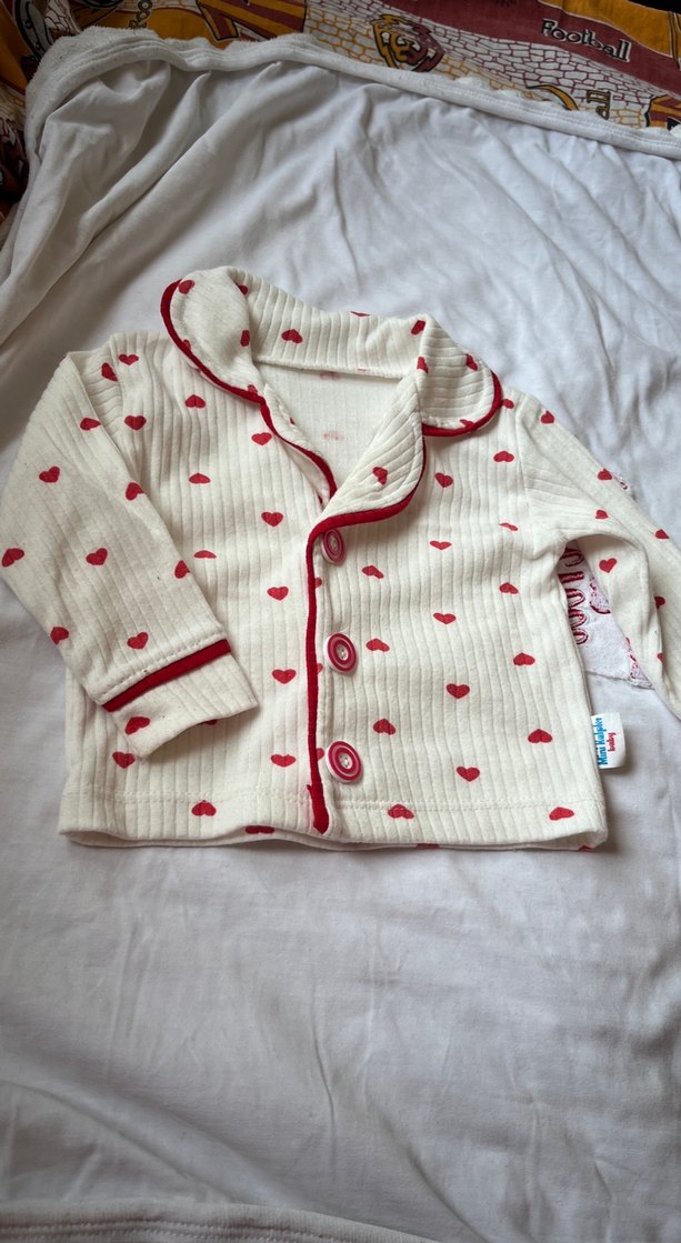 Beyaz zemin üzerine küçük kırmızı kalplerle süslenmiş, düğmeli kız bebek hastane kıyafeti. Yumuşak dokulu ve renkli detaylara sahip. ❤️