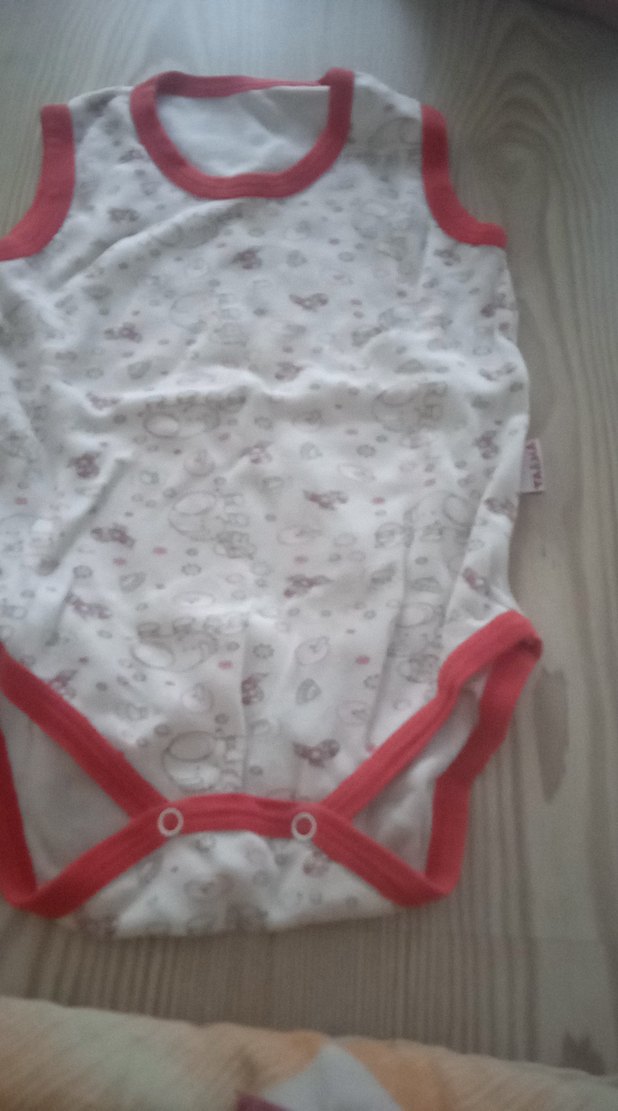 Kolsuz, V yakalı kız bebek body. Düğmeli ve pastel beyaz renkli, baskılı desene sahip, kırmızı kenarlıklıdır. biraz kullanılmış