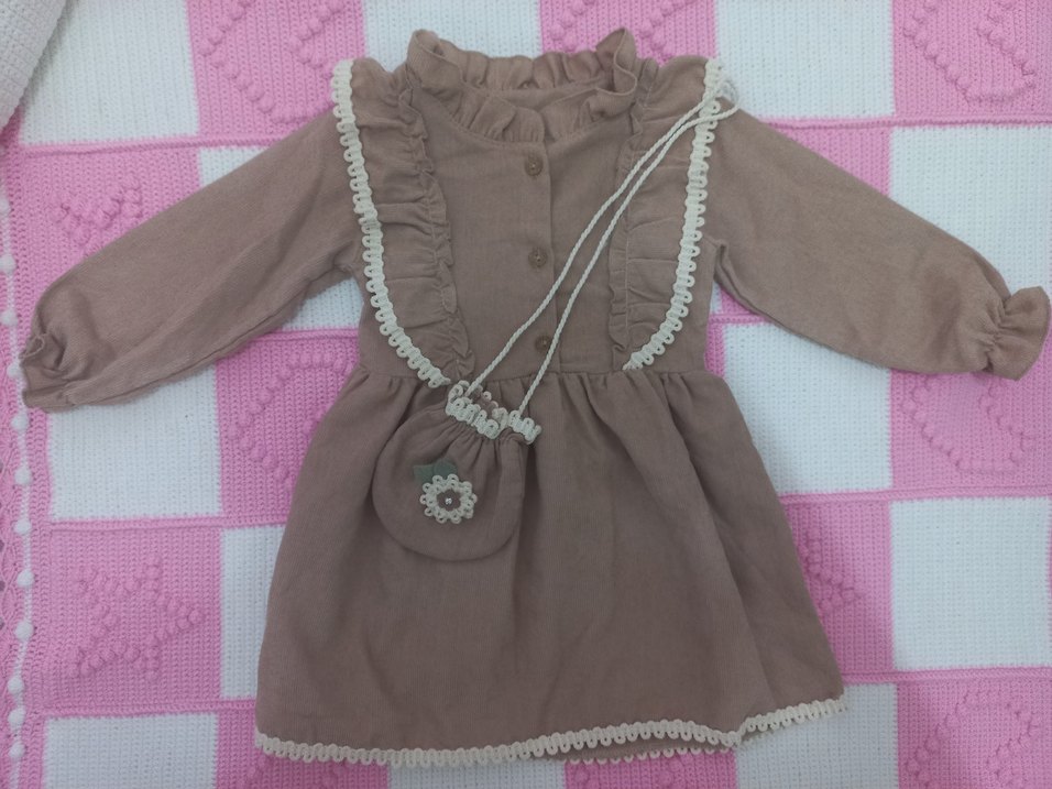 Rengi Kahve tonundadır. Elimde 2 beden mevcut ve hiç kullanılmadı. 2 yaş ve 4 yaş beden vardır. Bir tanesinin fiyatı mevcuttur. Çanta aksesuarlı.