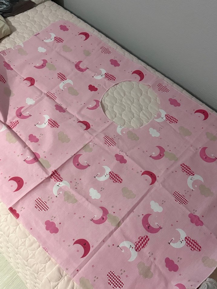 Pastel pembe renkli, ay ve bulut desenleriyle süslenmiş sentetik kumaştan çocuk uyku örtüsüdür. Emzirme örtüsü hiç kullanılmadı bende bi tane daha var bu fazla olduğu için satıyorum