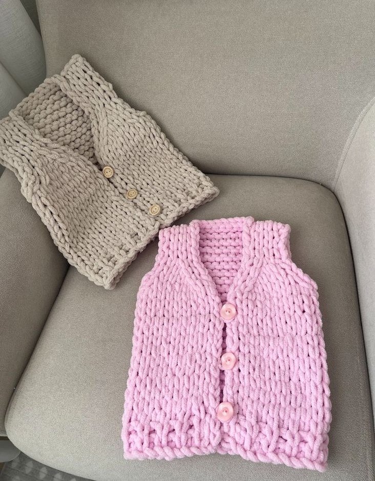Kız bebek ve erkek bebek için düğmeli, kolsuz triko yelekler. Pastel tonlarda, vücuda oturan kesimde, yumuşak örme kumaştan yapılmıştır.