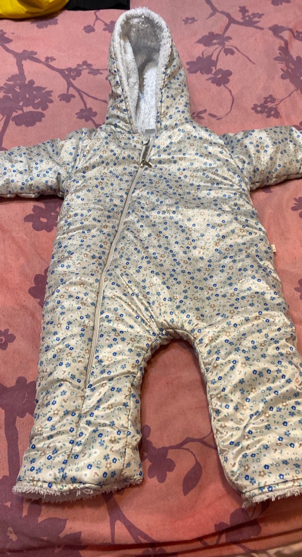Kız bebek için fermuarlı, kahverengi ve gri tonlarında hafif desenli, içi yumuşak ve sıcak tutan kar tulumu.