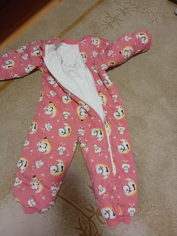 Pastel pembe renkli, baskılı kız bebek tulumu. Fermuarlı ve bisiklet yaka detaylıdır. ❄️ 2 tog kullanilmafi