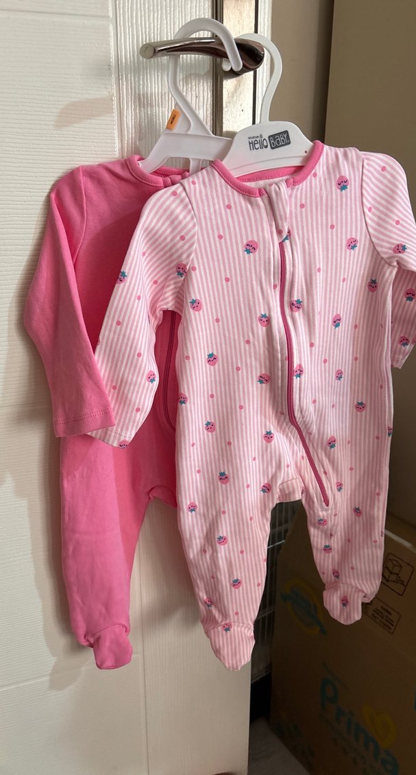 İki pastel pembe kız bebektulumu, biri düz diğeri küçük çiçek desenli, her ikisi de kolay giydirme için fermuarlı. 3 Ay 62 cm hello baby kalıbıdır. Temiz hiç giydirilmediler.