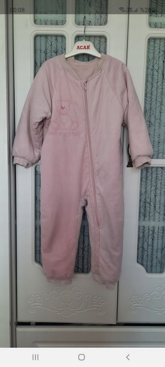 Pastel pembe renkli kız bebek tulumu, fermuarlı ve yakası notched lapel modelindedir. Yumuşak ve sıcak kumaştan üretilmiş olup, hafif ayıcık desenine sahiptir.