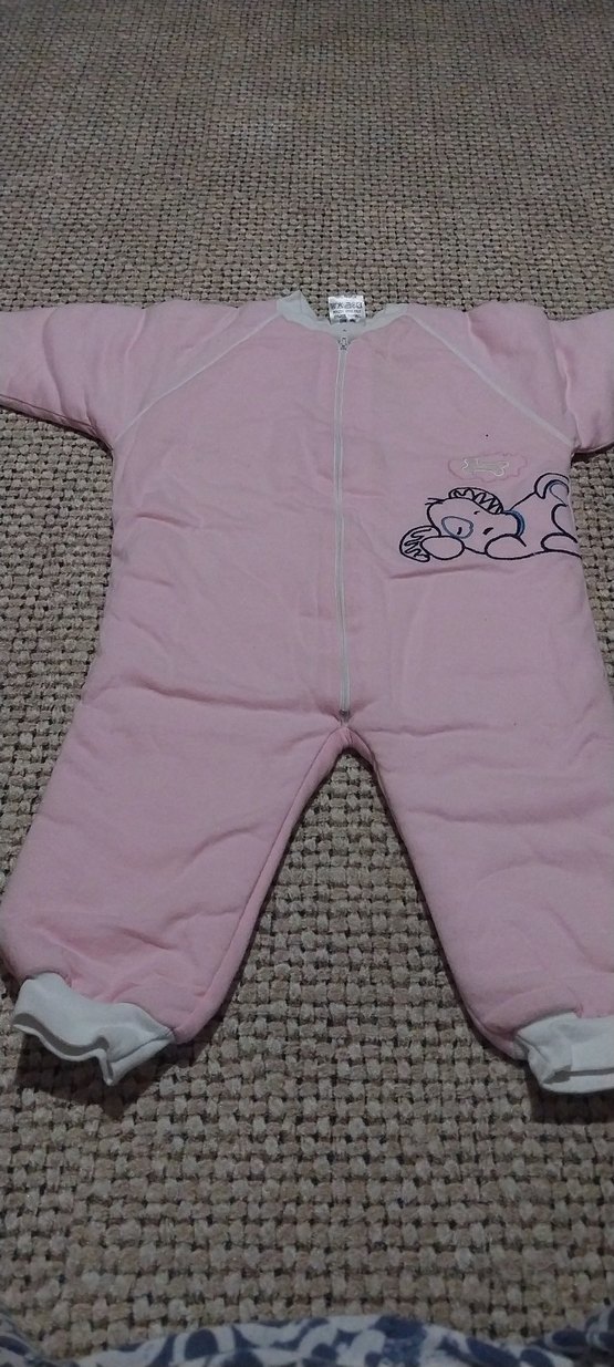 Pastel pembe kız bebek tulumu, bisiklet yaka ve kolay giyimi sağlayan ön fermuara sahiptir. Küçük hayvan figürü bulunur.