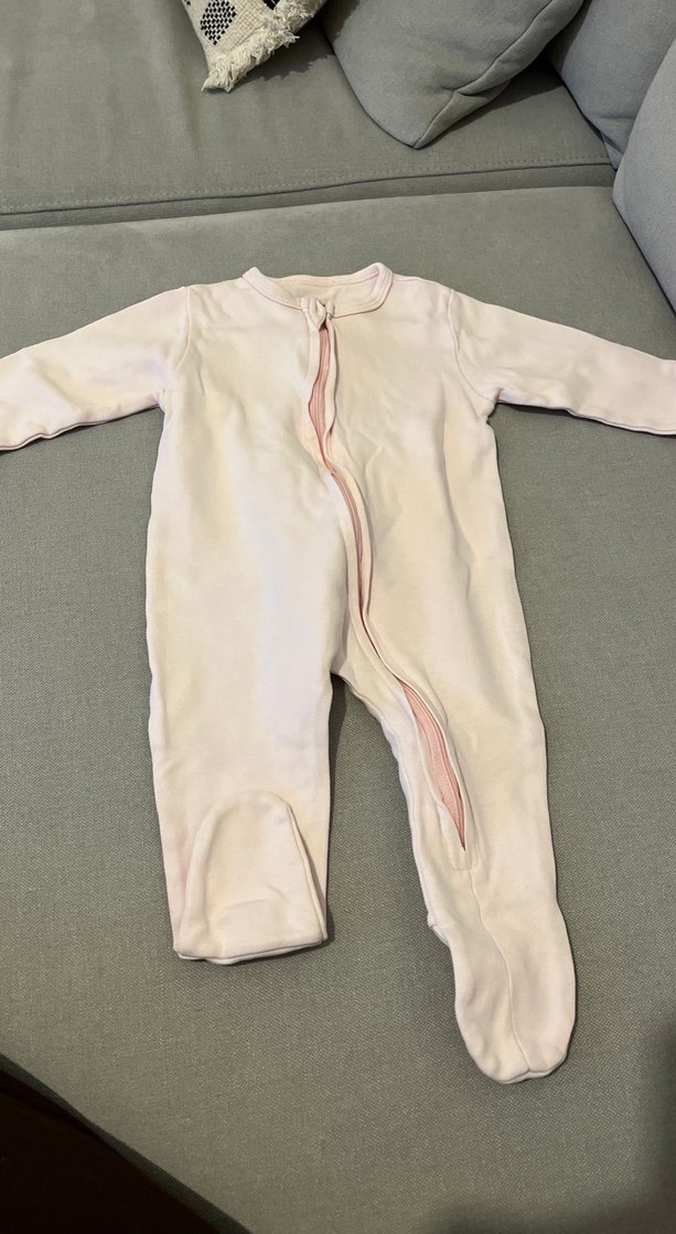 Pastel pembe kız bebek tulumu, kolay giydirme için fermuarlı ön kısmı ve yumuşak kumaşı ile rahatlık sağlar. Desensiz ve ayaklıdır.