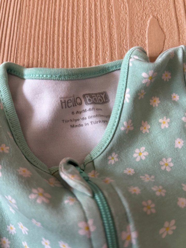 Pastel yeşil, uzun kollu, fermuarlı kız bebek body, yuvarlak yaka ve küçük çiçek desenli.