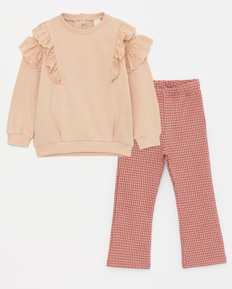 Kız bebekler için fırfırlı uzun kollu bej sweatshirt ve hafif desenli pantolon seti. Rahat ve yumuşak kumaştan üretilmiştir.