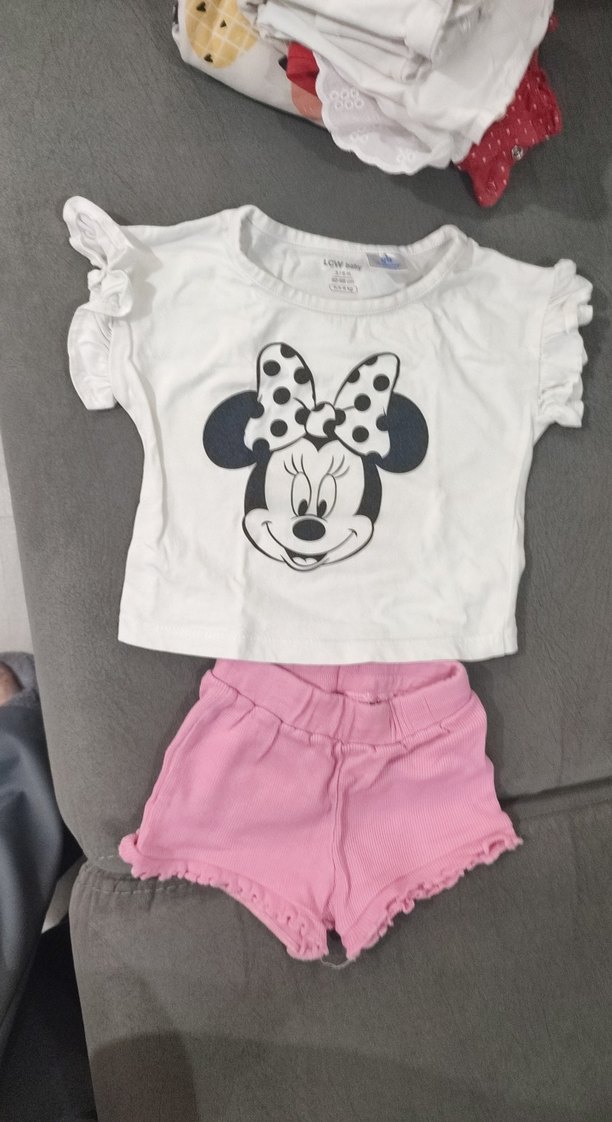 Kısa kollu beyaz tişörtü fırfırlı kollara ve Minnie Mouse baskısına sahip, pastel pembe fırfırlı şortla tamamlanmış kız bebek kıyafet takımı.