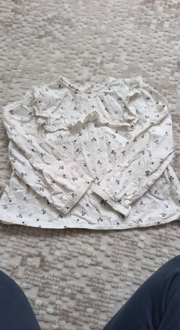 Beyaz pazen, uzun kollu, yakalı ve fırfırlı kız çocuk bluzu. 6-9 ay uygundur. Marka temsili yurtdışından alınmıştır.