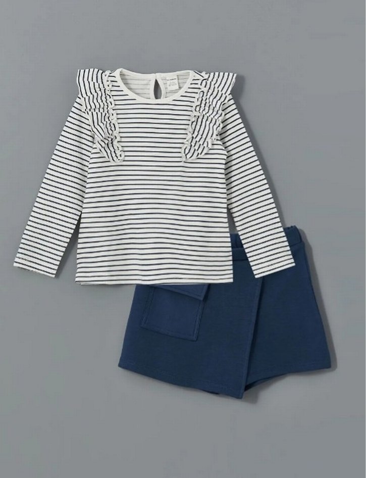 Kız bebek için beyaz ve gri çizgili, fırfırlı uzun kollu üst ve lacivert şorttan oluşan takım. Üstte kolay giydirme için arka düğmeli açıklık bulunur.