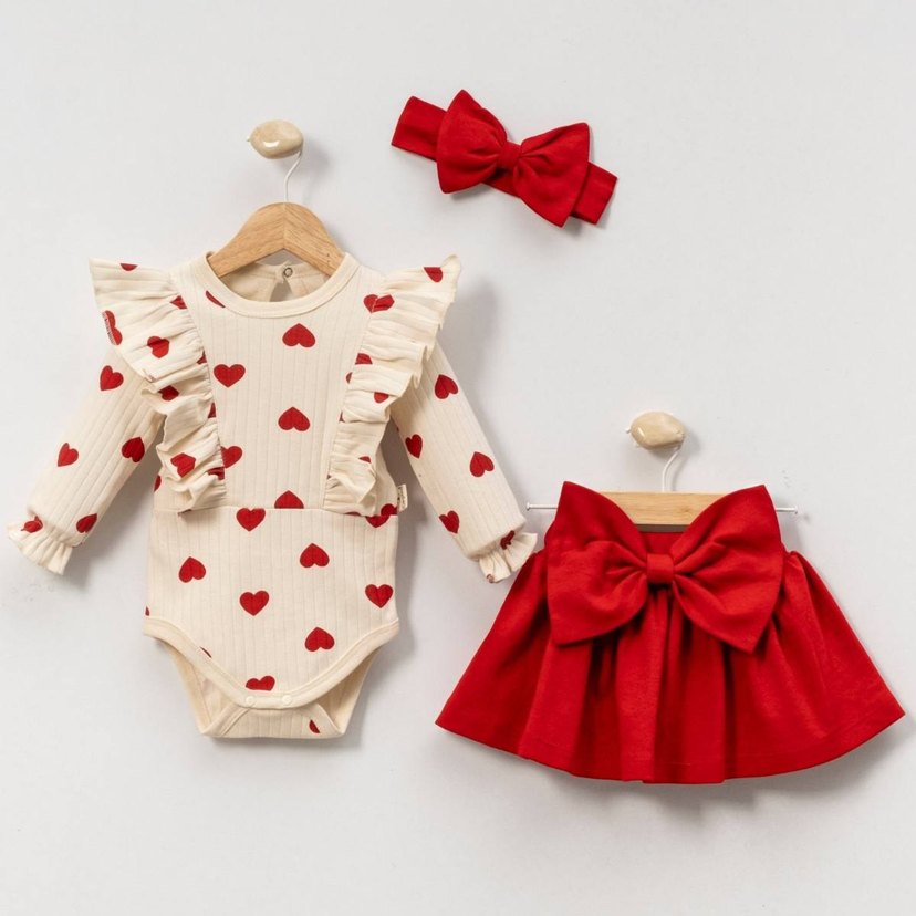 Uzun kollu, fırfırlı ve kalp desenli body, büyük fiyonk detaylı kırmızı etek ve uyumlu saç bandından oluşan kız bebek seti. ❤️