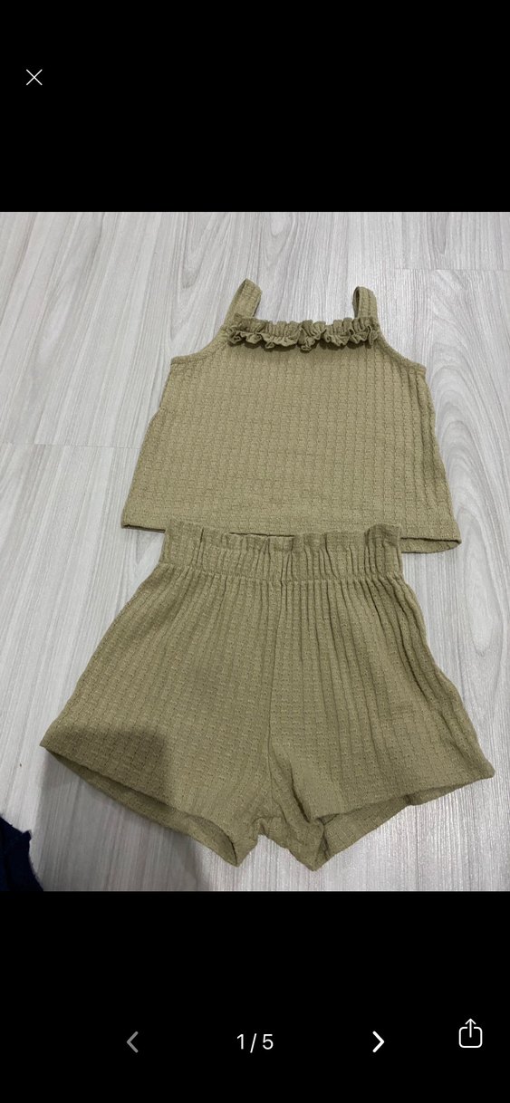 Kolsuz, üst kısmında fırfır detaylı bej kız bebek takımı. Yumuşak, dokulu kumaştan, lastikli bel şort ile.