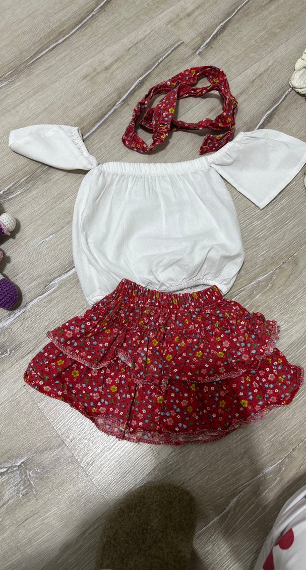 Beyaz kısa kollu nakışlı bluz, kırmızı çiçekli fırfırlı etek ve uyumlu saç bandından oluşan kız bebek 3'lü takım. 1 kere çekim için giyildi 3-6