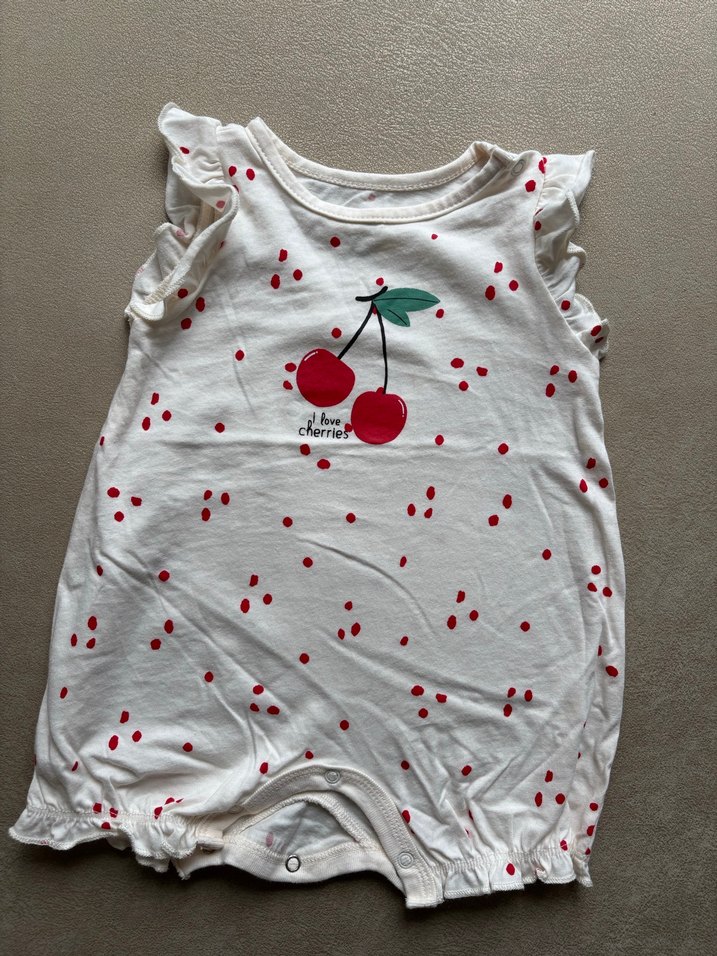 Yumuşak kumaştan, kiraz baskılı ve omuzlarda fırfırlı beyaz kız bebek tulumu. Lc wakiki ürünü üç dört kez giyildi yeni