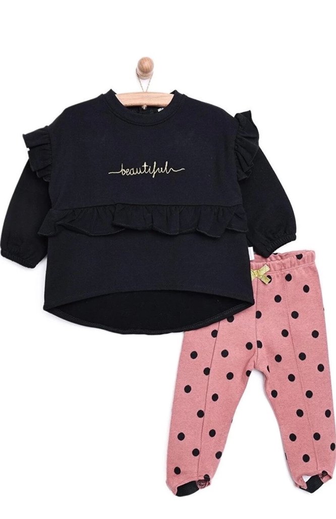 Fırfır detaylı ve "beautiful" nakışlı koyu renk uzun kollu üst ile siyah puantiyeli tayt kombini. Bebetto marka e bebekten almıştım 2 yaş bedenli üstü fırfırlı arkası çıtçıtlı siyah renk altı lila üzerine siyah puantiyeli ayaktan lastik geçirmeli tayt takımı.Sayılı giyilmiştir gayet iyi durumdadır sadece son fotoda parmağımla gösterdiğim yerde minicik bir lekesi var