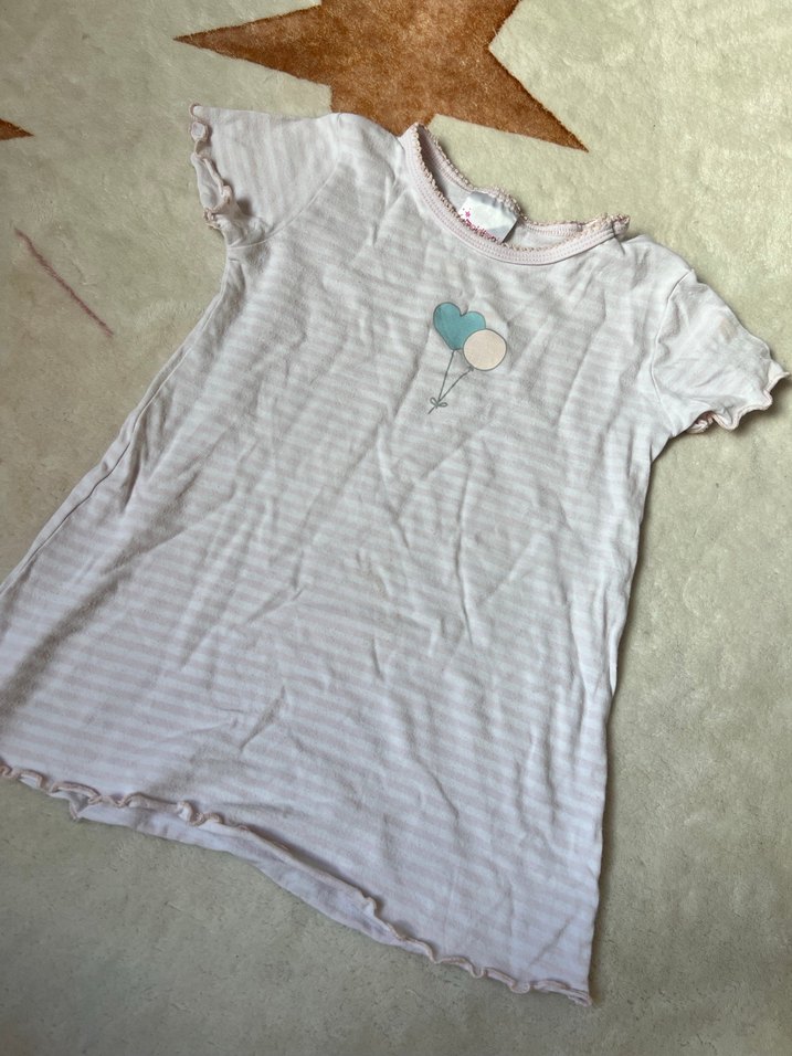 Kız çocukları için, kısa kollu pamuklu tişört. Bol kesim, bisiklet yaka, küçük balon desenli. Yumuşak ve rahat kumaşlı.