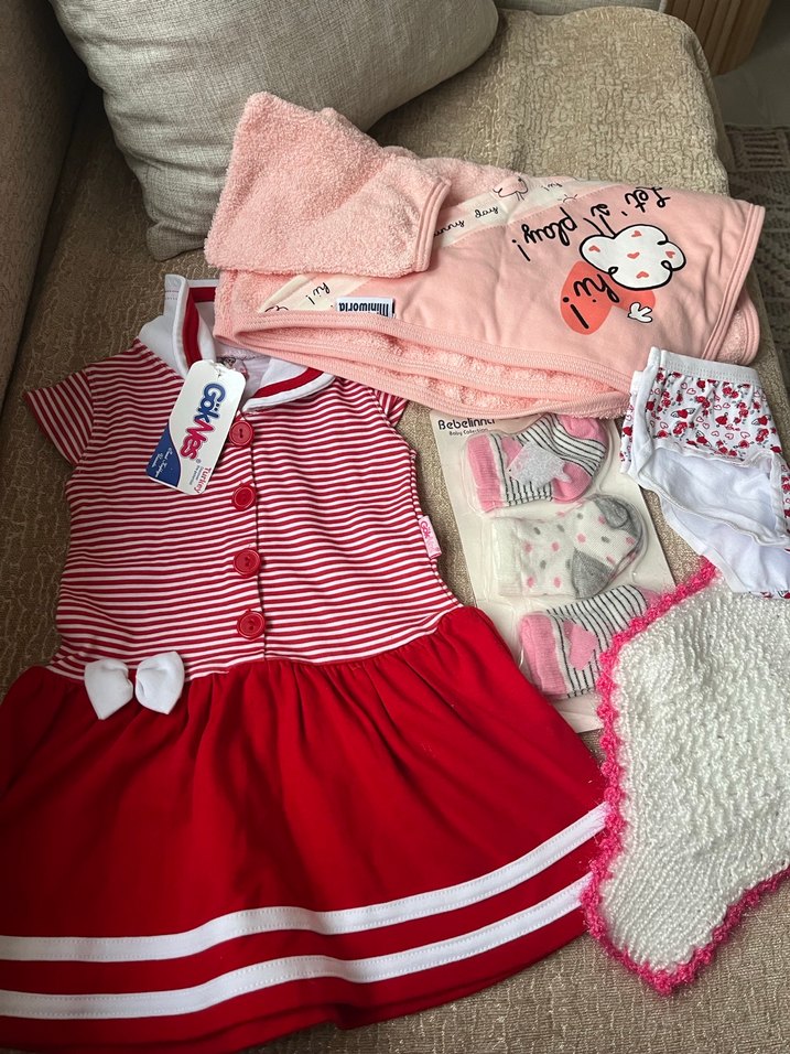 Renkli kız bebek seti, düğmeli kırmızı beyaz çizgili kısa kollu örgü elbise, sevimli baskılı pembe bornoz set yumuşak çoraplar ve pembe kenarlı beyaz örgü bez içerir.