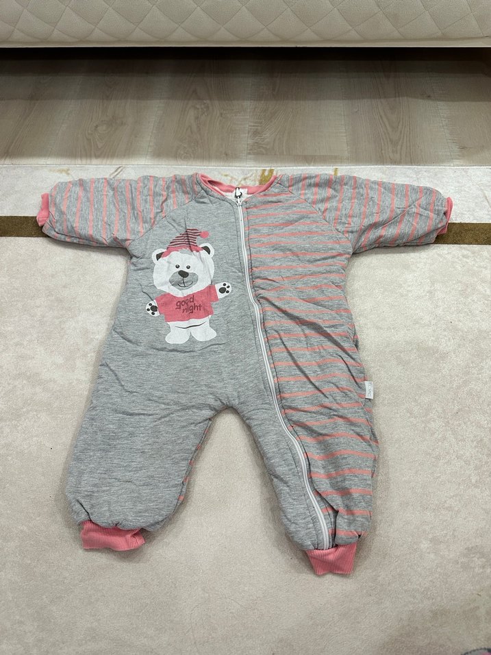 Gri renkli, fermuarlı ve bisiklet yaka kız bebek tulumu. Baskılı ayı figürü ve çizgili deseniyle sıcak tutar. ❄️ Boy 60 cm (4.ç) #bebek #giyim #kıyafet